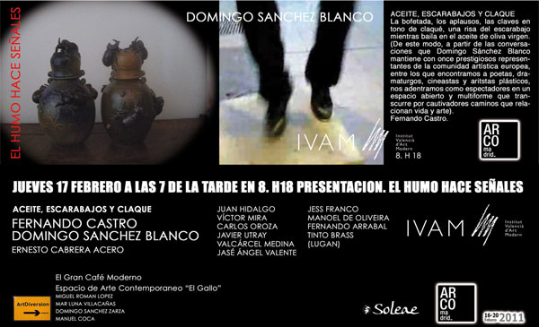 Fernando Castro presenta así la obra: «Aceite, escarabajos y claqué. La bofetada, los aplausos, las claves en tono de claqué, una risa del escarabajo mientras baila en el aceite de oliva virgen. De esto modo, a partir de las conversaciones que Domingo Sánchez Blanco con prestigiosos representantes de la comunidad artística europea , entre los que encontramos dramaturgos, cineastas, poetas, artistas plásticos, nos adentramos como espectadores en un espacio abierto y multiforme que transcurre por cautivadores caminos que relacionan arte y vida».