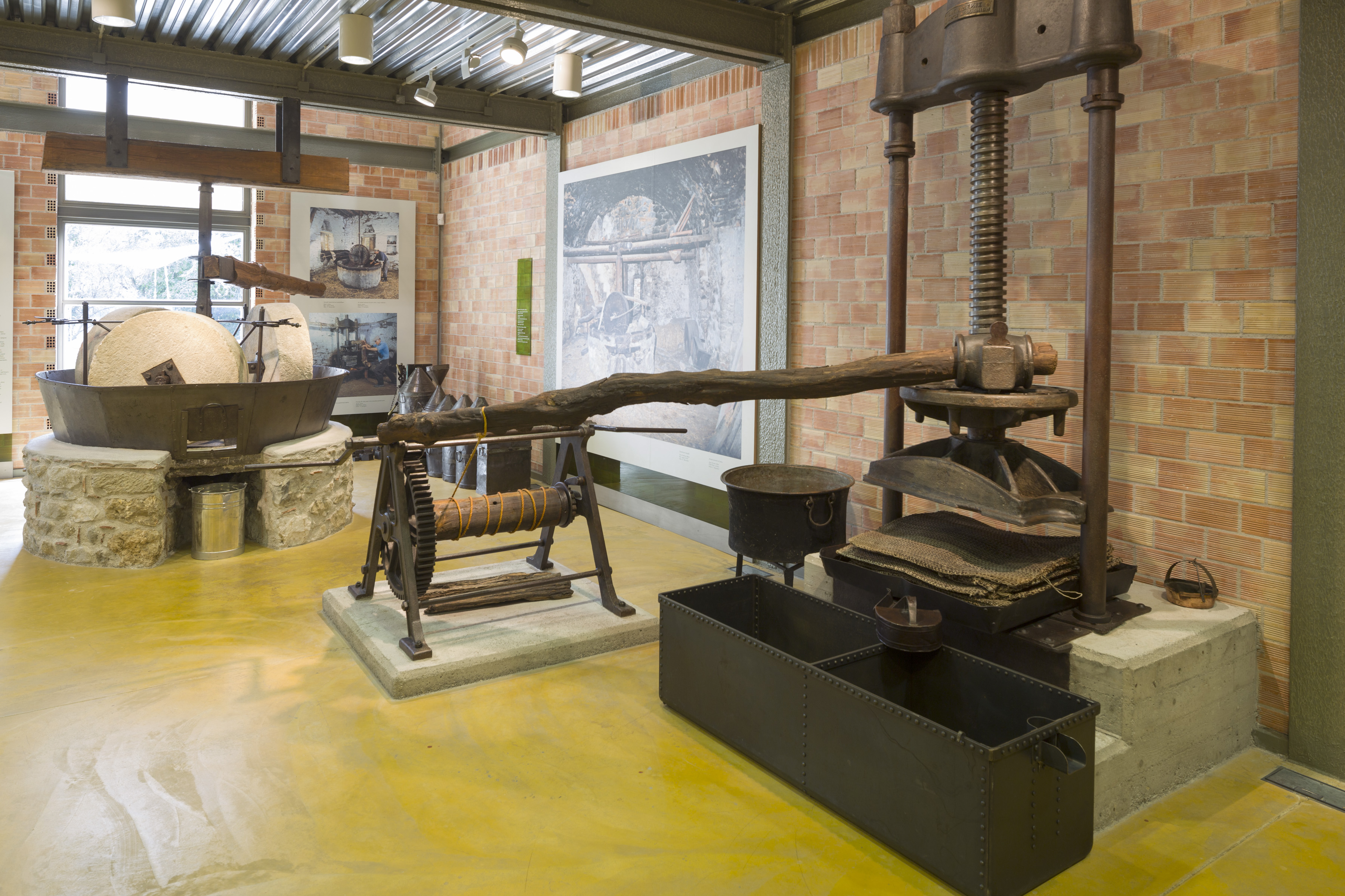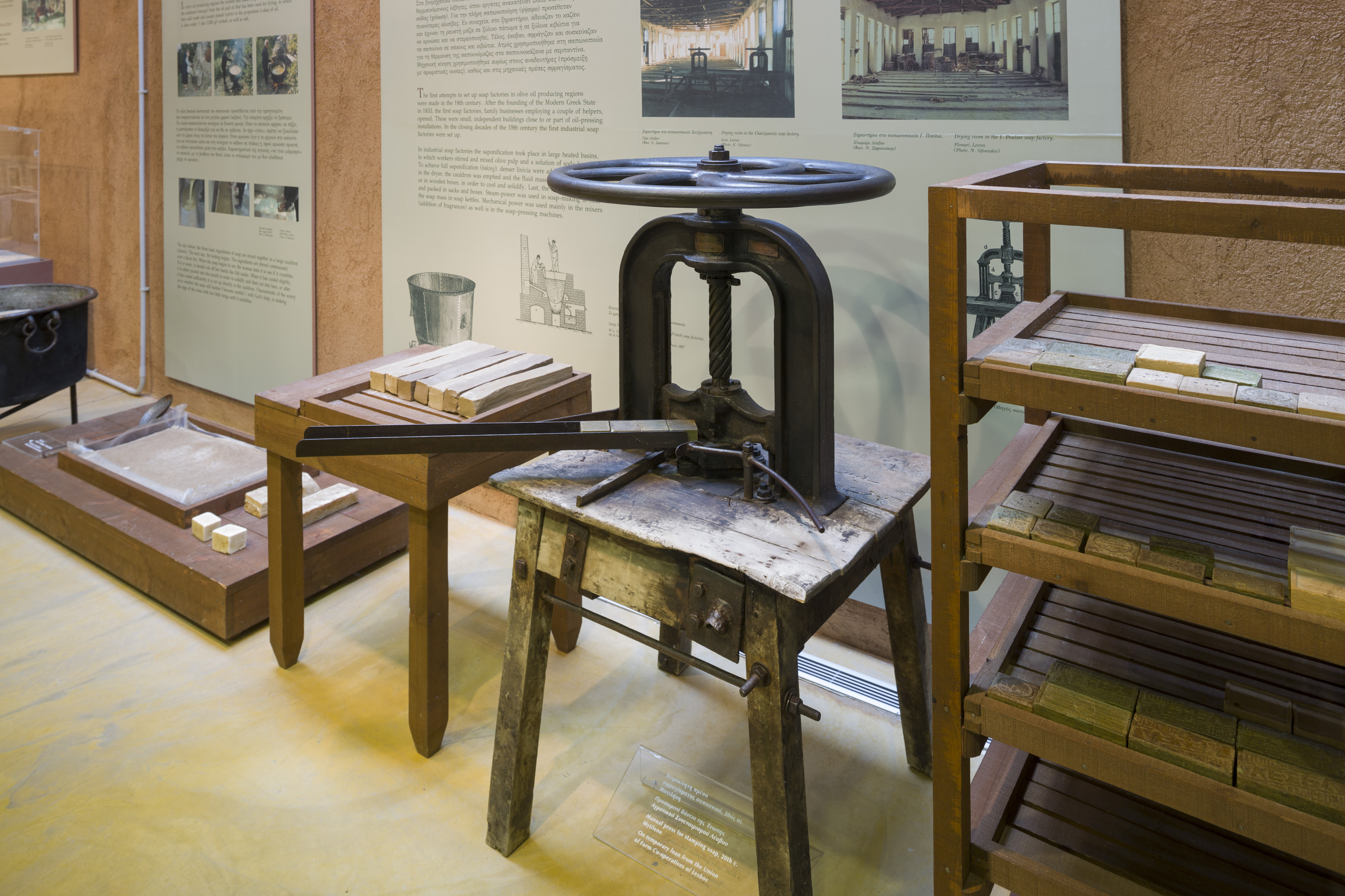 El recorrido de la exposición se desarrolla en la planta baja del museo, donde las exposiciones abordan la evolución cronológica de la tecnología relacionada con las prensas de aceite en Grecia, desde el período posbizantino hasta la primera mitad del siglo XX. Comprenden mecanismos que han sido restaurados, así como grandes modelos animados de prensa de oliva (accionados por agua, impulsados por vapor y diesel) que ayudan a los visitantes a captar las técnicas tradicionales para producir aceite de oliva, dando vida al tiempo en que las prensas de aceitunas formó el eje alrededor del cual giró la economía local. La visita se completa con información sobre la fabricación de jabón en la vida cultural y económica de la región.