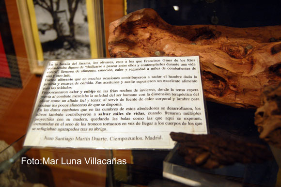 Dentro de las instalaciones encontramos un Museo Etnológico y Museo de la Guerra Civil a través de la Batalla del Jarama. Quiero destacar una pieza curiosa en relación a nuestro tema del olivo: hay restos de madera de este árbol con impactos de bala pues detrás de los olivos se refugiaban los combatientes en plena batalla.
