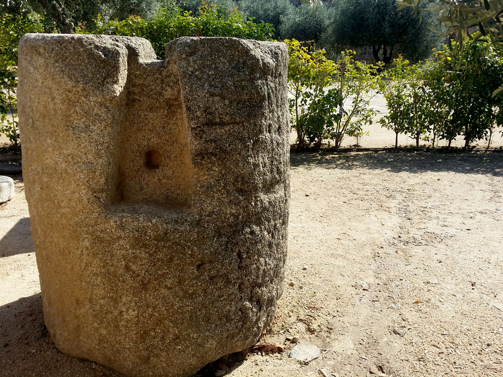 En las imágenes podréis ver los restos de dos contrapesos cilíndricos de granito pertenecientes a una prensa de viga. Este modelo, utilizado ya por los romanos, se ha mantenido sin modificaciones a lo largo de varios siglos. Mediante presión se licuaba la pasta de aceitunas extraída previamente en un molino de piedra y el zumo se deslizaba por pequeños canales hasta llegar a los depósitos de decantación.