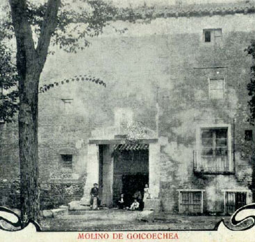molino-goicoechea-ZaragozaEste molino fue mandado construir por Juan Martín de Goicoechea (Bacaicoa, Navarra 1732-Zaragoza 1806), empresario y prócer radicado Zaragoza que anteriormente se había dedicado a la industria textil… y que la abandonó por no parecerle de gran porvenir en Aragón. Así pues, pasados unos años de duda (1779-85) decidió aprovechar el solar de un hilador de seda de su propiedad para construir un molino de seis prensas, cuatro para oliva y dos para sansa (orujo) y tres bodegas con capacidad para unas 2.000 arrobas de aceite (la arroba zaragozana para aceite equivalía a 13,93 litros).